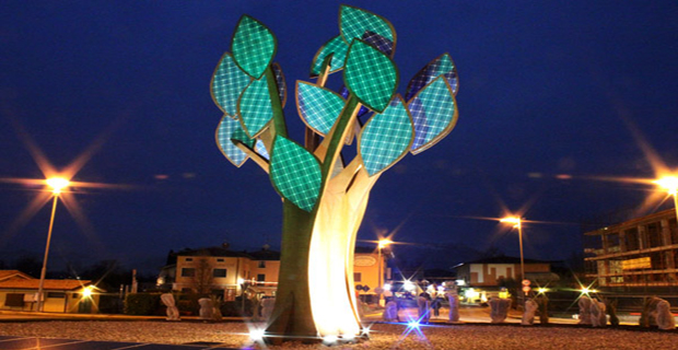 L’albero fotovoltaico diventa quasi un’opera d’arte, arricchendo la scena di una piazza, un chiostro o un parco.