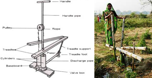 La pompa di aspirazione è costituita da due cilindri di metallo azionati dai piedi che si muovono sui pedali. La semplicità della struttura e la reperibilità del materiale fa sì che il prodotto sia facilmente riproducibile dalle aziende locali.