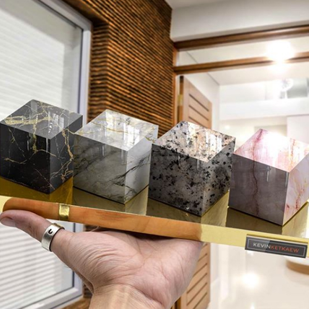 Kévin Ketkaew è il pasticciere dietro le creazioni scultoree che più che torte sembrano blocchetti di marmo. Si tratta di dessert architettonici nella forma di parallelepipedi perfetti, con lati affilati e spigoli appuntiti lavorati per avere l'effetto di pietre da costruzione: marmo, granito e quarzo rosa, brillanti come se fossero stati lucidati. All'interno si nascondono gustosi strati di dolcezza.