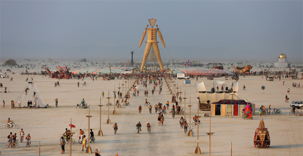 Il Burning Man è un festival nato nel 1991 che si svolge a Black Rock City, a nord di Reno, nel bel mezzo del deserto del Nevada e dura poco più di una settimana, tra fine agosto e gli inizi settembre. Gli organizzatori dell’evento e gli stessi fondatori non lo considerano un evento mondano ma un esperimento artistico, sociale e radicale fine a se stesso, in cui tutti sono coinvolti. Le persone si riuniscono a Black Rock portandosi tutta l’attrezzatura necessaria alla propria sopravvivenza, quale tende da campeggio, generatori elettrici, cibo, acqua e i vestiti adatti al clima del luogo, che prevede giornate caldissime, notti freddissime e tempeste di sabbia. Ogni partecipante è libero di organizzare installazioni artistiche di ogni tipo, spettacoli musicali o teatrali, workshop e giochi: ogni esibizione al quale si assiste è fatta da personaggi non famosi e niente viene pubblicizzato. Le uniche forme di scambio possibili sono il baratto e il dono: il denaro serve solamente all’acquisto del biglietto d’ingresso e a comprare ghiaccio e caffè, uniche cose in vendita. L’uso di macchine fotografiche a scopi commerciali è limitato e il cellulare non prende perché non c’è campo, per cui le persone sono necessariamente “costrette” ad interagire solo tra di loro e con le forme di arte sparse per il luogo. Indispensabile: arrivare in macchina oppure portarsi dietro una bicicletta, uno skateboard o un qualsiasi altro mezzo che possa agevolare gli spostamenti per la playa!