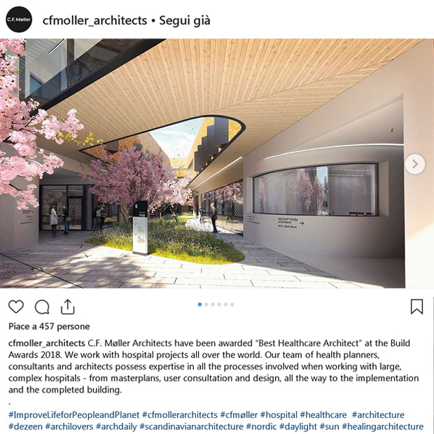 Rimaniamo in nord Europa con lo studio CF Moller architects. Si tratta di un gruppo di professionisti che proseguono con passione un lavoro iniziato nel 1924, anno in cui venne fondata la società in Danimarca. Sono molto attenti all’aspetto sostenibile dei loro progetti e amano particolarmente la progettazione ospedaliera; sono infatti stati premiati come “Best Healtcare Architects” ai Build Awards del 2018.