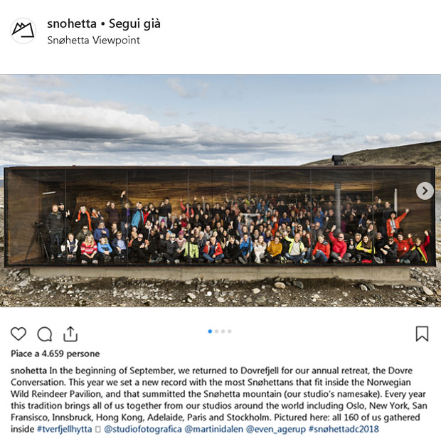 La foto più interessante? quella scattata per il ritrovo che ogni anno organizzano a Dovrefjell, in Norvegia, con collaboratori provenienti da tutte le sedi internazionali della società; quest’anno hanno raggiunto il record di partecipanti, 160 “Snøhettans” che hanno scalato la montagna Snøhetta da cui prende il nome la loro grande “famiglia”.