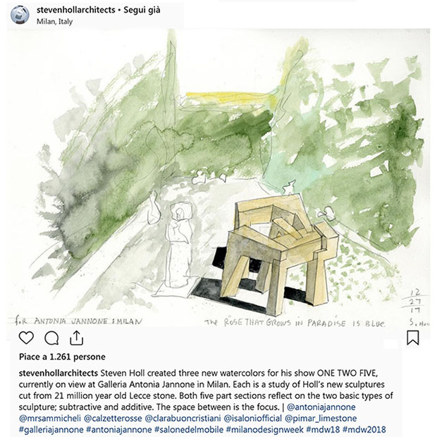 Il profilo dello studio Steven Holl Architects è molto attivo; pubblica infatti almeno una foto a settimana e, in alcune occasioni, anche un paio al giorno. Le immagini degli edifici realizzati vanno dalla grande alla piccola scala, sottolineando come questo team ami curare tutti i dettagli dei propri progetti. Accattivanti sono gli schizzi in acquerello, strumento molto amato dall’architetto americano per la concezione dei suoi progetti, perché, come afferma egli stesso, “ogni edificio ha un’idea. Non si tratta solo di soddisfare un programma”.