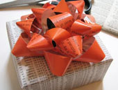 E’ il momento del fiocco. Ne possiamo scegliere di tanti tipi diversi, tutti realizzabili anche nella versione eco! Anche il questo caso, il consiglio è prima di tutto quello di riutilizzare quelli dei regali ricevuti in passato, ma se non siete stati così previdenti da conservarli, niente paura! Il modo per essere ugualmente eco–friendly c’è: bastano forbici, carta, colla, una spillatrice, vecchie riviste o fogli di giornale e soprattutto un po’ di tempo e la voglia di farlo. Per realizzare una coccarda, si devono ritagliare 9 strisce di carta di lunghezze diverse e piegarle in un modo particolare per poi assemblarle insieme a colpi di cucitrice. Bastano poche mosse e la vostra coccarda sarà pronta. Vi invito a seguire questo tutorial sulla realizzazione di una coccarda eco, anche questa personalizzabile scegliendo una carta che ben rispecchi gli interessi del destinatario del regalo.