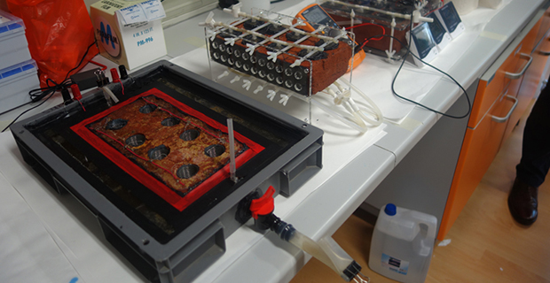 Un mattone veneziano trasformato in MFC Microbial Fuel Cell (Cella a combustibile microbico) e presentato alla Biennale di Venezia del 2016.