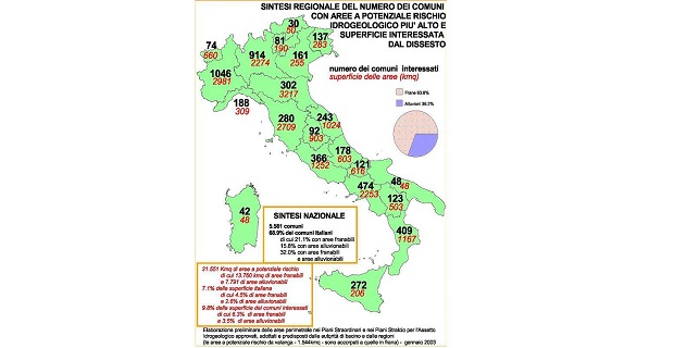 La percentuale di suolo impermeabile, responsabile per la gran parte dei danni dovuti a precipitazioni improvvise, raggiunge il 15% soprattutto nelle fasce costiere e pedemontane, quelle più sensibili.