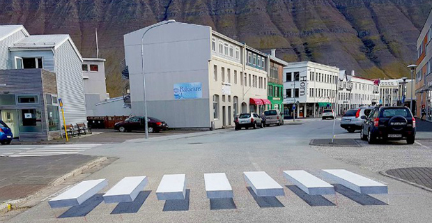 La trovata delle strisce pedonali 3D sta funzionando talmente bene in India che in Islanda in una delle vie centrali della cittadina islandese di Ísafjördur si è pensato di ricorrere allo stesso espediente, sebbene nel Nord Europa il traffico sia notevolmente regimato rispetto a quello indiano. La proposta per la realizzazione delle strisce 3D è stata sottoposta all’amministrazione locale a settembre e con il consenso dell’autorità per i trasporti locale alla fine dello scorso mese esse sono state realizzate.
