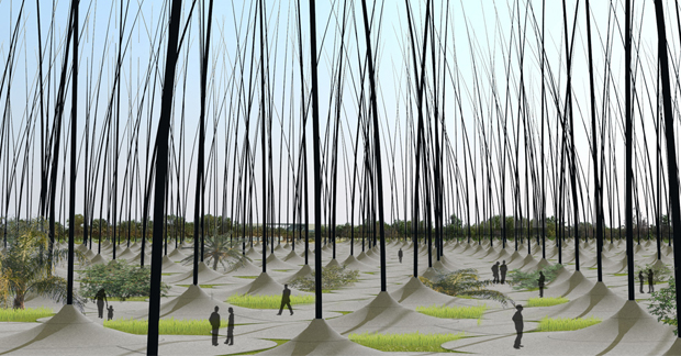 Un altro prototipo progettato dalla società newyorkese Atelier DNA per la città di Abu Dhabi si chiama Windstalk. Si tratta di milleduecento pali in fibra di carbonio rinforzati da resina, con un’altezza di 55 metri sostenuti da una base a forma cilindrica, il cui raggio varia dai 10 ai 20 metri. Ogni palo ha un giunto alla base di 30 cm, che come un capello si assottiglia fino alla punta. I pali contengono una pila di dischi di ceramica piezoelettrica che si deformano grazie alla trazione del vento, direttamente proporzionali alla forza del vento. L’effetto prodotto da questi dovrebbe imitare l’oscillare dei fili d’erba al vento con integrata sulla sommità una luce a led che aumenterà e diminuirà d’intensità in rapporto all’energia prodotta.