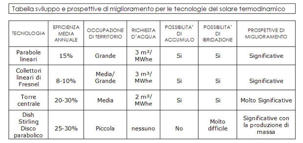 I sistemi CSP, a differenza della Tecnologia del Fotovoltaico, consentono di produrre energia anche nei periodi di riduzione e/o di mancanza della radiazione solare, attraverso sistemi di accumulo o di combinazione con impianti a combustibile fossile. Inoltre sotto il punto di vista dell’efficienza, negli ultimi anni, sono stati fatti grandi passi in avanti; i fluidi termoconvettori dei captatori sono stati sostituiti da miscele di Sali che consentono di raggiungere altissime temperature di esercizio (550°C) con la riduzione dei rischi legati all’uso dei fluidi termoconvettori (oli infiammabili) in chiave di sicurezza.