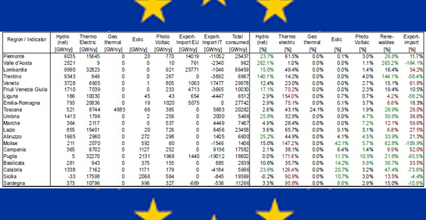 Le regioni che maggiormente dipendono dalle importazioni di energia elettrica per oltre il 25% del loro consumo interno totale sono risultate le seguenti: Lombardia, Veneto, Toscana, Umbria, Marche, Lazio, Campania, Basilicata.