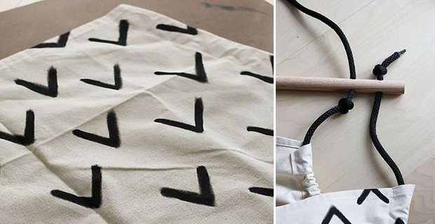 Fase 6: Posizionare la tela su un grande foglio di cartone e dipingere un motivo (come ad es. delle V), se si vuole, dopo che sia completamente asciugato un lato, si può dipingere anche l’altro. In alternativa si può scegliere un tessuto stampato.