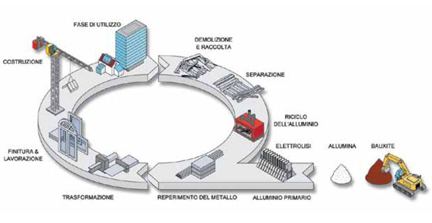 L’allumina o ossido di alluminio viene ricavato dalla bauxite, un minerale estratto principalmente in Australia, Brasile, Africa occidentale ed India occidentale; tramite elettrolisi è possibile ottenere l’alluminio. Questo materiale può anche essere riciclato: in tal caso, la quantità di energia necessaria per condurre a termine questo processo è pari al 5% di quella che occorrerebbe per la produzione dalla materia prima: per questo oggi, oltre la metà dell’alluminio prodotto in Europa, deriva da materie prime riciclate; l’unico limite a questa trasformazione è dato dalla quantità di materiale da riciclare già presente e quindi immessa sul mercato anni fa: si tratta di quantità notevolmente inferiori rispetto all’attuale domanda del mercato, che deve essere quindi integrata con alluminio di produzione primaria.