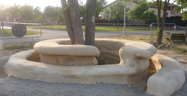 Elemento di arredo urbano che funge da tavolo e da seduta realizzata da Davide Frasca in collaborazione con Donato Mancini in un parco pubblico, Italia. © Vide Terra