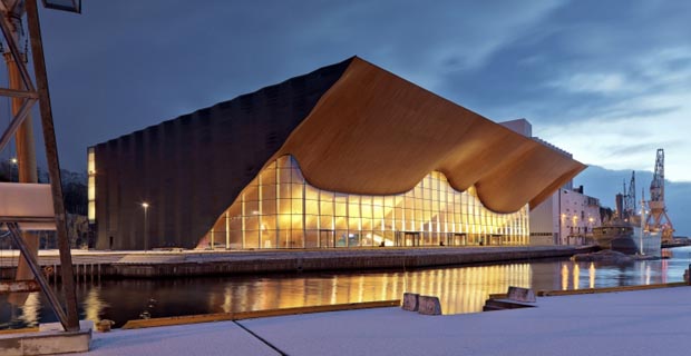 Il nuovo teatroKilden, “il pozzo”, dello studio d’architettura finlandese ALA e del norvegese “SMS Arkitekter AS”, a Kristiansand, nel Nord della Norvegia, si concentra attorno ad un percorso che porta immediatamente verso la performance. La forma monumentale della parete ondulata in quercia locale attira il pubblico dallo spazio esterno e lo porta naturalmente “dal paesaggio naturale al regno delle arti dello spettacolo".
