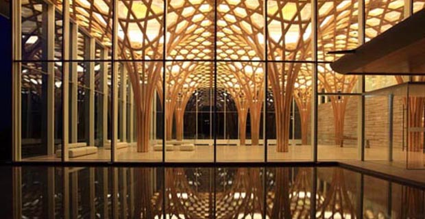 Shigeru Ban ha progettato anche l’Haesley Nine Bridge Club House di Yeoju in Corea, composto da tre edifici distinti con tre destinazioni differenti e tre sistemi costruttivi diversi: il primo è una conchiglia a maglia esagonale di legno, una struttura ecologica che ricorda il disegno dei tradizionali cuscini estivi coreani e ventilata naturalmente, il secondo è in acciaio ed l’ultimo in cemento armato. Ognuno presenta tecniche costruttive che rivisitano quelle tradizionali coreane, ma l’aspetto più singolare dell’intervento è indubbiamente la copertura lignea del primo edificio, non solo per la bellissima struttura, ma anche per il sistema computerizzato di calcolo, disegno e taglio degli elementi strutturali che ha permesso di minimizzare lo spreco di legno, di ottenere una forma strutturale più efficiente e di irradiare gli ambienti di luce ed aria naturali.
