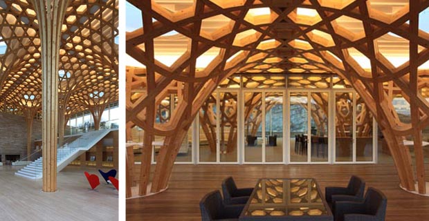 Legno lamellare è stato impiegato per la copertura del Centro Pompidou–Metz, progettato dall’architetto giapponese Shigeru Ban e dal francese Jean de Gastines. Il museo d’arte moderna e contemporanea ha un sorprendente tetto ligneo che ricorda i cappelli tradizionali cinesi in bambù ed è costruito con un intreccio di assi, della lunghezza totale di 18 km, secondo un modulo esagonale, a sostegno di una leggera membrana in fibra di vetro e Teflon (PTFE) traslucida. I materiali da costruzione ecologici e la ventilazione, l’illuminazione ed i sistemi di trattamento delle acque sono stati scelti secondo criteri di efficienza energetica per realizzare un edificio a basso consumo in linea con la politica “verde” del Comune di Metz.
