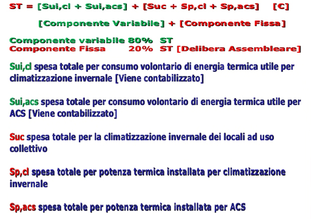 Tutte le spese relative all’impianto di riscaldamento vengono accorpate in un’unica voce (ST) e la suddivisione viene fatta in base a una quota fissa (Qf), pari a una percentuale della ST (tra il 30% e il 50%). Questa viene poi ripartita tra i condòmini in base ai millesimi di proprietà e a una quota a consumo (Qc), pari alla rimanente parte della spesa (Qc = ST - Qf); successivamente viene ripartita in parti proporzionali al consumo individuale misurato. In altri termini, dette U1, U2, …Un le unità di calore conteggiate per ciascun utente, le singole quote variabili saranno: